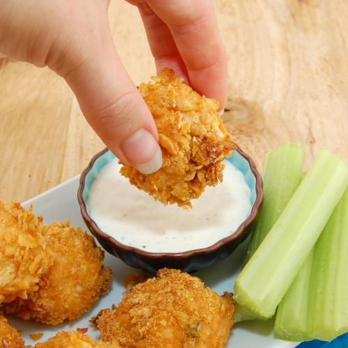 Dip each chicken ball first into the flour, then the egg and ending with the Corn Flakes. Place on the prepared baking sheet and bake for 20 to 25 minutes. Serve warm with ranch or blue cheese dressing.
