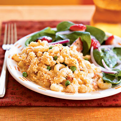 Preheat oven to 400°. Cook pasta in boiling water 6 minutes. Drain and rinse with cold water; drain. Combine pasta, ham, and peas in a large bowl.