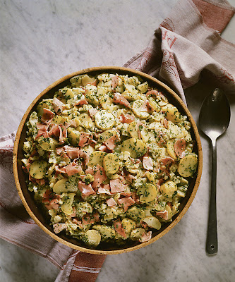 In a large bowl, combine the potatoes, onion, bacon and parsley. In a small bowl, combine the remaining ingredients. Pour over potato mixture; toss to coat. Refrigerate for 1 hour or until chilled.