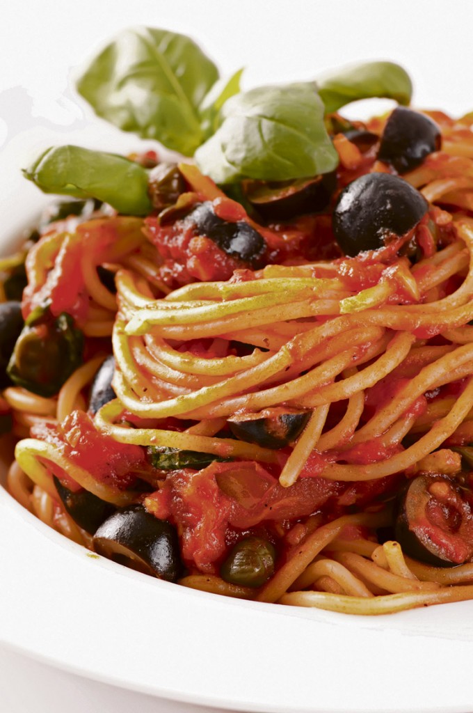 Heat oil in a medium pan and add garlic and capsicum. Cook gently until capsicum is soft (about 5 minutes). Add tomatoes, olives, capers and capsicum. Cover and simmer for 10 minutes.