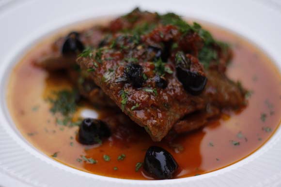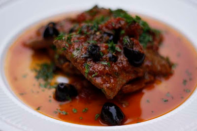Transfer meat into an oiled baking dish, arranging the pieces of veal side by side. Place the olives, slices of tomato, capers, herbs, wine, salt and pepper into a bowl and crush with your hands place over veal drizzle with olive oil.