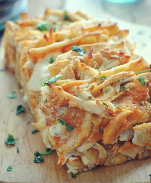 Brush the dough with the buffalo sauce. Sprinkle the shredded chicken over the sauce.