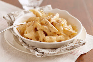 Meanwhile, cook cream cheese, Parmesan, butter and milk in large saucepan on low heat until cream cheese is melted, stirring frequently. Add pumpkin and seasonings; stir. Cook until heated through, stirring occasionally.